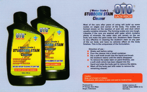 Stubborn stain cleaner is very effective in cleaning the stubborn stain on any part of the car body and have no adverse effect on the body finishes. This is the uniqueness of the formulation. Available in 600ml bottle. |